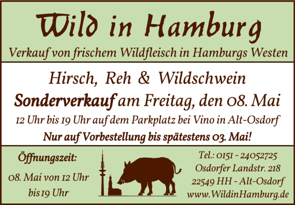 Bei Wild in Hamburg finden sie frisches Wildfleisch aus der Region, frisch vakuumiert und daher lange haltbar und ideal zum Einfrieren - aber natürlich am besten sofort zu geniessen! Wildschwein, Hirsch und Reh - das edle Schück vom Rücken, der Braten aus der Keule oder bereits geschnitten als Edelgulasch. Ob auf Bestellung oder spontan vorbeikommen, hier finden sie die beste Grundlage für Wilde Gerichte und damit für ein gemütliches Essen im Kreis der Familie oder mit Freunden. Zudem haben wir mit der Wildbratwurst, Schinken, Salami oder Leberwurst vom Wild auch diverse Wildspezialitäten für den kleinen Hunger zwischendurch. (siehe Wildes Angebot).